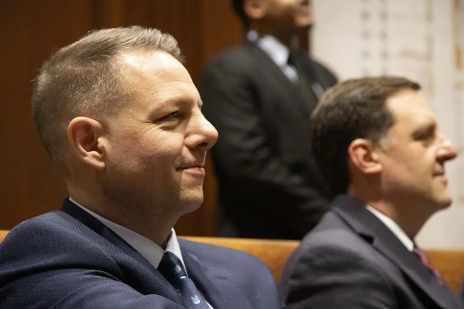 State Rep. James Arciero of Westford, left, listens at a House Democratic caucus on Jan. 1, 2025. (Chris Lisinski/SHNS)