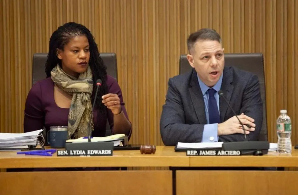 Rep. James Arciero (right) and Sen. Lydia Edwards (left) preside over a hearing on Jan. 18, 2024. (Photo by Chris Lisinski/State House News Service)