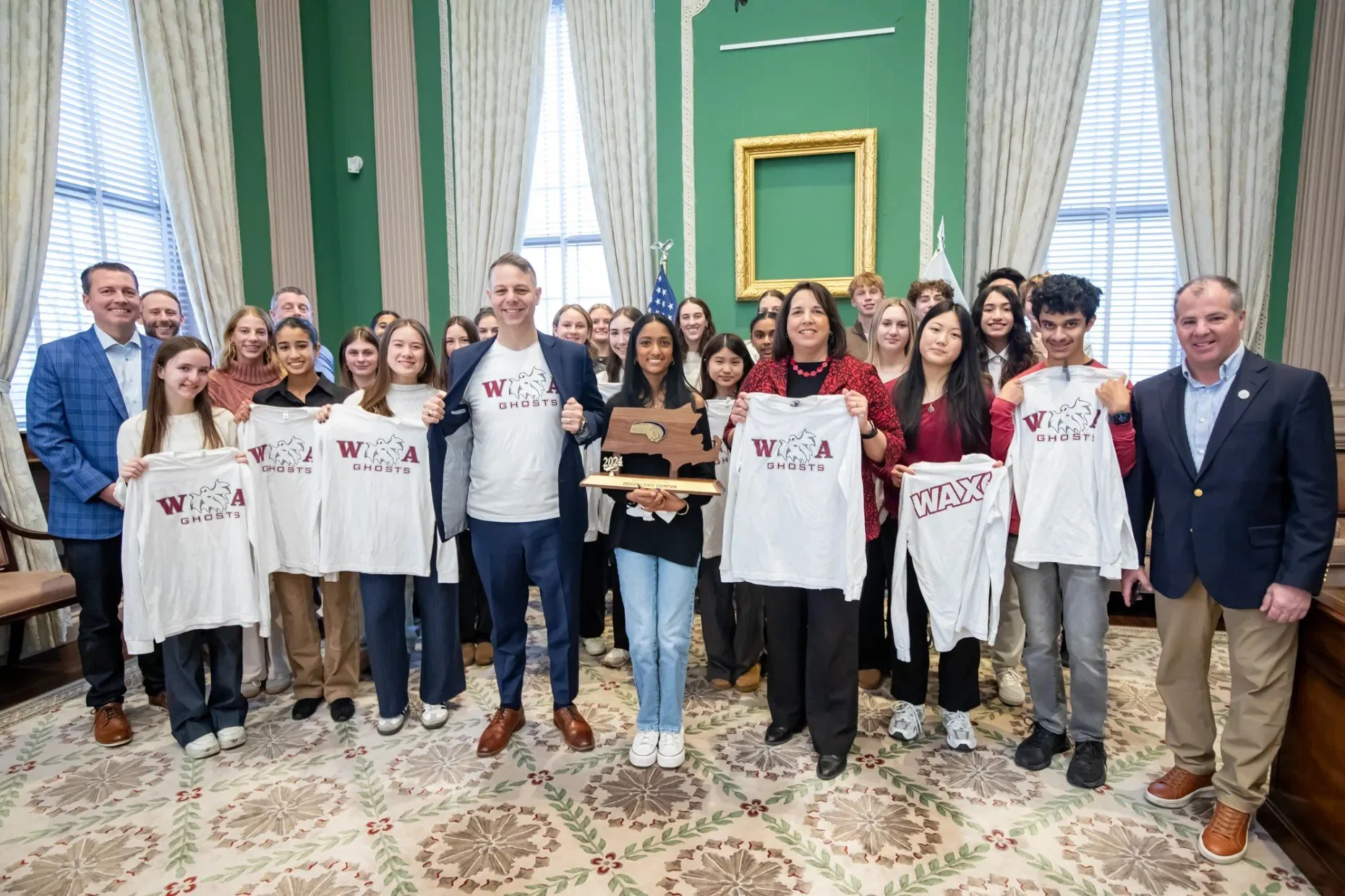 The team — alongside WA cross country coaches Phil Archambault, Paul Hajjar, Scott Hafferkamp and WA Athletic Director Jeff Bunyon — received an official tour of the Massachusetts House and Senate Chambers prior to meeting with Driscoll and attending a lunch hosted by the legislators in recognition of their historic 2024 season.